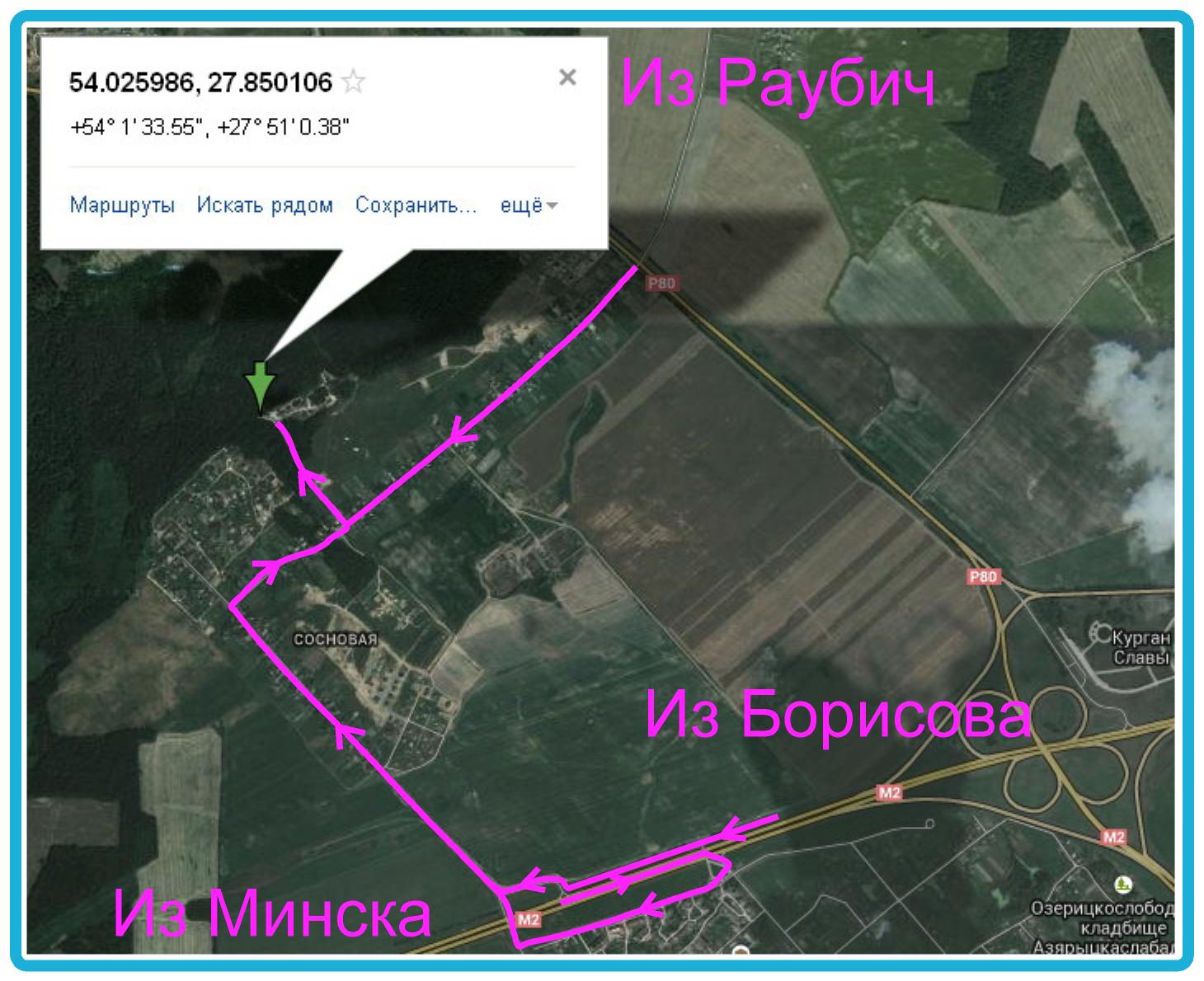 При движении по М2 свернуть в деревню Сосновая. Далее по маркировке.