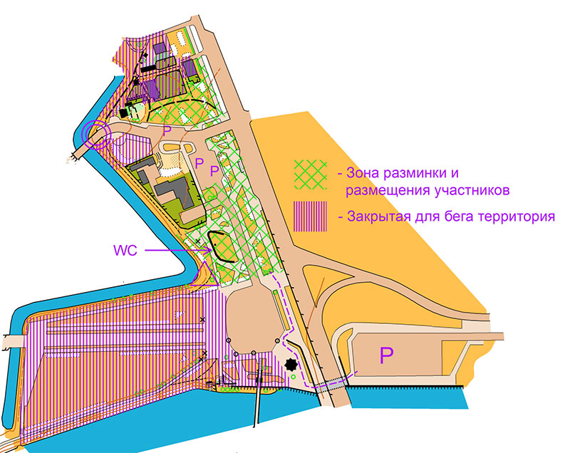 Скальные стенки высотой 8 – 10 метров (на карте показаны соответствующим знаком), запрещенные участки для бега (на карте показаны пурпурной заливкой), скальные ямы (на местности промаркированы красно-белой лентой), участки с колючей проволокой.