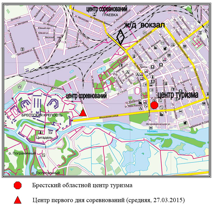 От центра соревнований, от мест проживаний (СШ № 13, колледж связи) на остановках по проспекту Машерова автобусом № 17 (расписание на остановках) до остановки «Крепость». Пешком от центра соревнований 1,5 км.