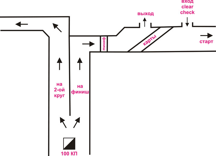 Участники на дистанции дважды проходят через 100й КП. Отметившись первый раз, уходят в левый коридор на второй круг. После второго круга уходят в правый коридор, на финиш. После смотрового КП (100й) до финиша 0,8-1км.