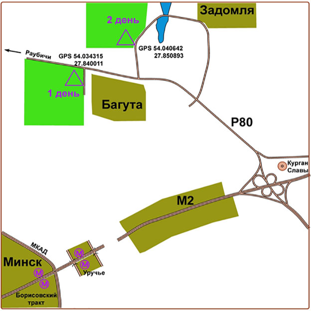 3) Разминка в 1 день проводиться по дороге от парковки вдоль дачных домов. Во 2 день - от парковки вдоль шоссе к водоему.